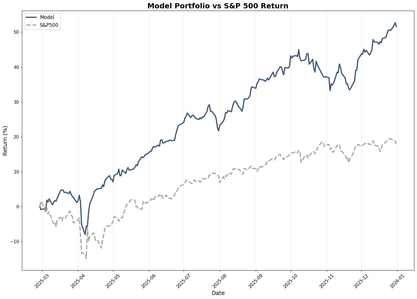 For the full year since inception on February 28th, the model generated +51.7% total return versus +17.9% for the S&P 500—outperforming the benchmark by 33.8 percentage points in just ten months.