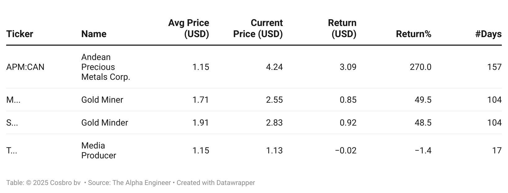 APM was on many levels an interesting pick, being both a gold and silver miner with some operational issues but with many catalysts going for it. Two other interesting precious metal miners picks are up almost 50% in 3 months. My most recent pick comes from a completely different market that currently faces (perceived) headwinds and seems overly punished by the market. We will see how that plays out.