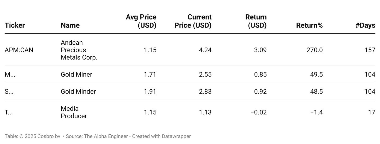 The portfolio's current largest position is gold and silver miner APM, a deep-dive stock that has surged 308% since entry. BKTI, a radio communications equipment company, represents another multibagger in the portfolio, up 130%. The systematic approach has already realized one multibagger (AAC, a satellite technology provider, sold June 2nd at +126%) and two additional positions with 90%+ returns, while currently holding five positions with gains exceeding 80%.