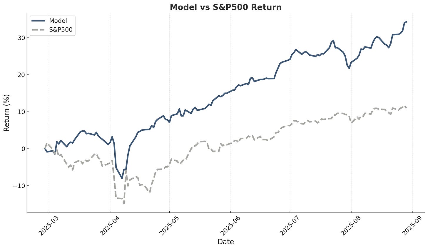 The model portfolio delivered its strongest monthly performance in August, returning 10.3% versus 2.0% for the S&P 500—an outperformance of 8.3 percentage points in a single month. Remarkably, the portfolio has beaten the S&P 500 in five out of six months since inception, with July being the sole exception.