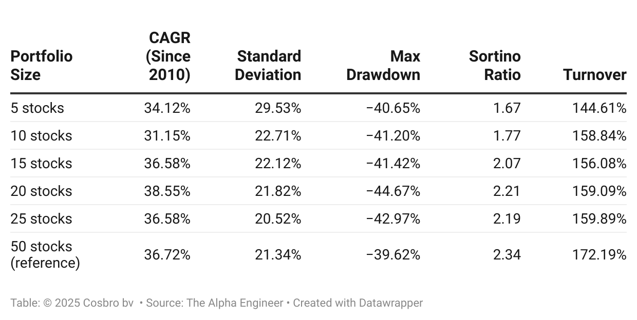 The data suggests that historically, concentrating the strategy into 15-25 stocks maintained comparable returns while requiring fewer positions to monitor and manage.