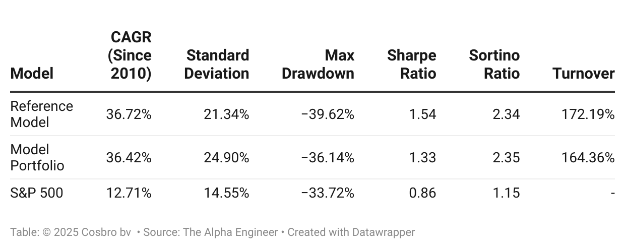 Due to outliers in the historical data, differences of 2-3% in performance metrics should not be considered statistically significant. The standard deviation of approximately 20-25% across most variants reflects the model's tendency to capture multibaggers—a characteristic of the methodology. The downside deviation is much closer to the S&P 500 benchmark (see spreadsheet).