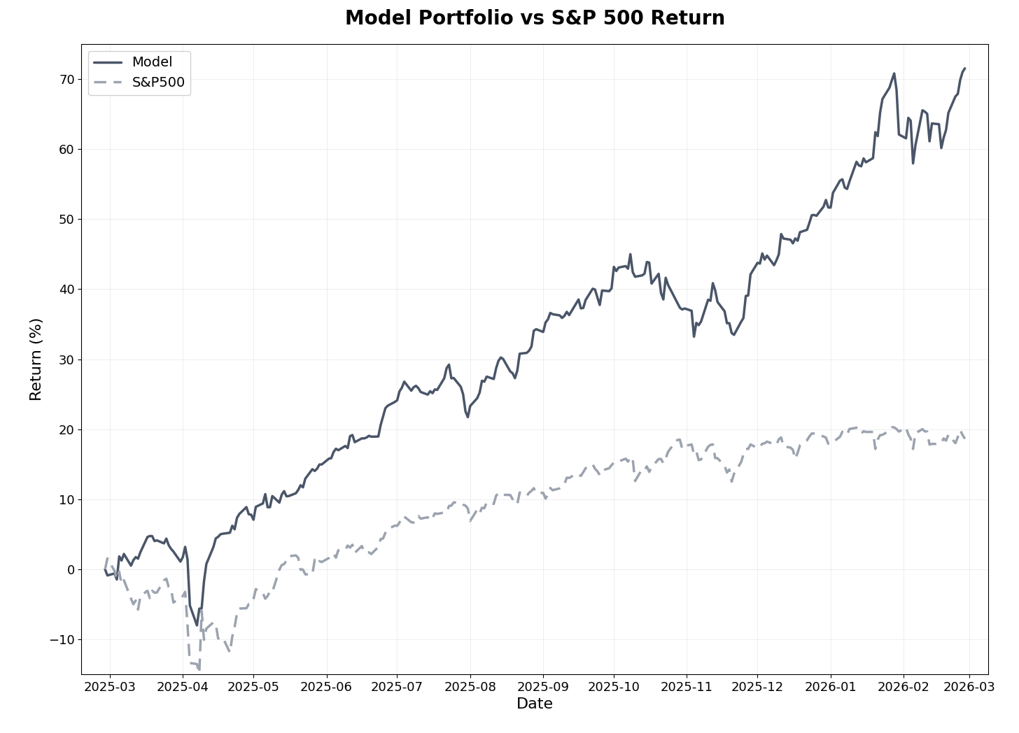 February marked another month of meaningful outperformance, with the model generating +5.82% versus -0.86% for the S&P 500 — an excess return of +6.69% for the month.