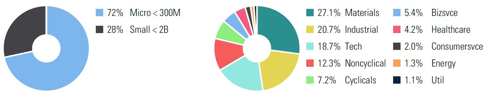 Current allocation remains concentrated in microcaps (72%) and small caps (28%), with Materials (27%) and Industrials (21%) as the largest sector exposures.