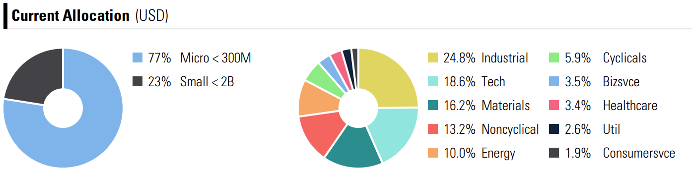 Current allocation remains concentrated in micro-caps (77%) and small caps (23%), with Industrials (24.8%), Technology (18.6%), and Materials (16.2%) as the largest sector exposures.