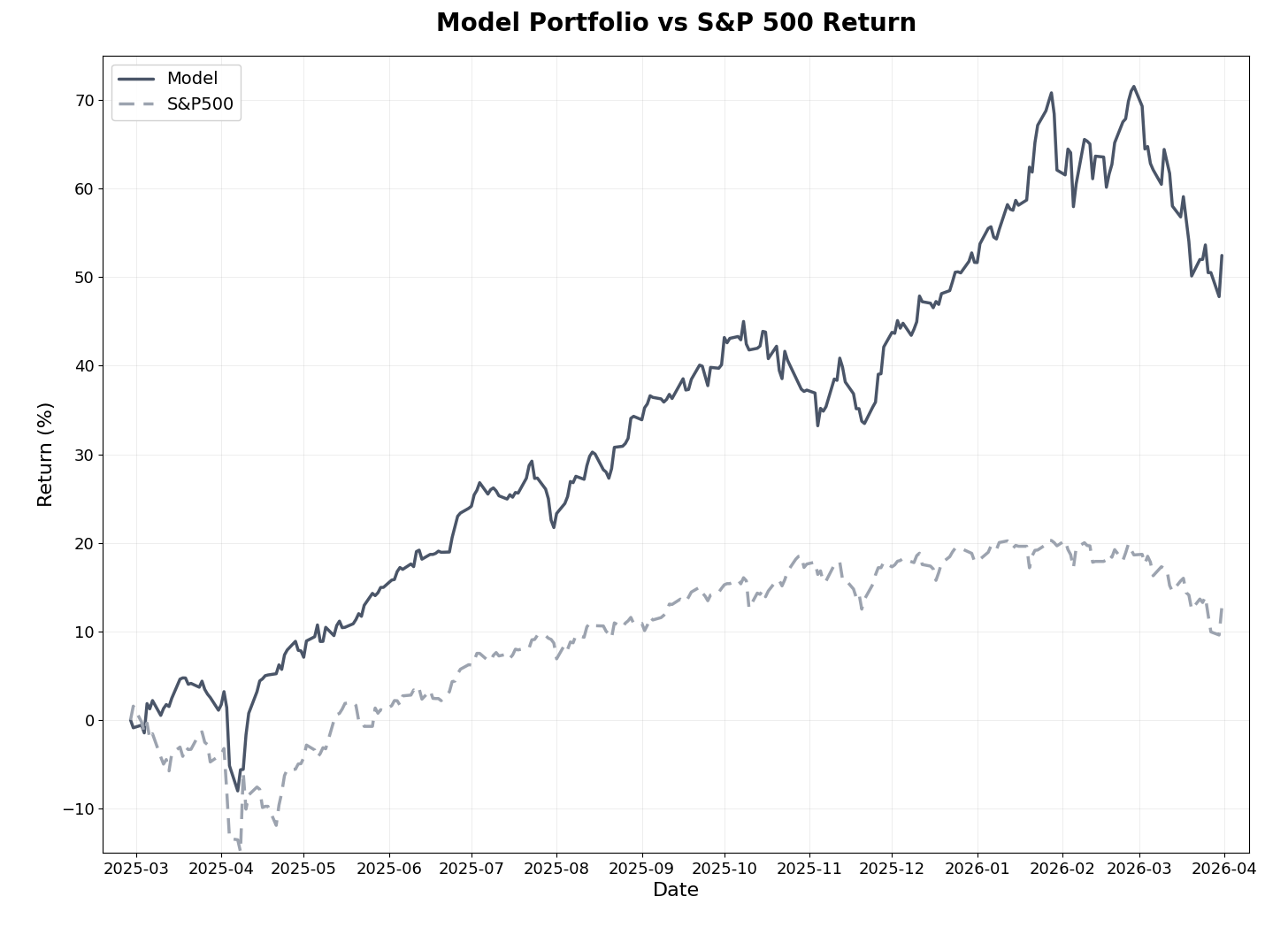 The portfolio’s low beta of 0.21 is worth emphasizing in context. The model’s returns are driven overwhelmingly by stock-specific selection rather than broad market exposure. In months where broad market factors dominate — as in March, when macro forces drove correlations sharply higher across asset classes — a low-beta portfolio with concentrated sector exposures can temporarily underperform. The systematic approach does not attempt to time macroeconomic events; it captures alpha through persistent factor exposures that compound over time.