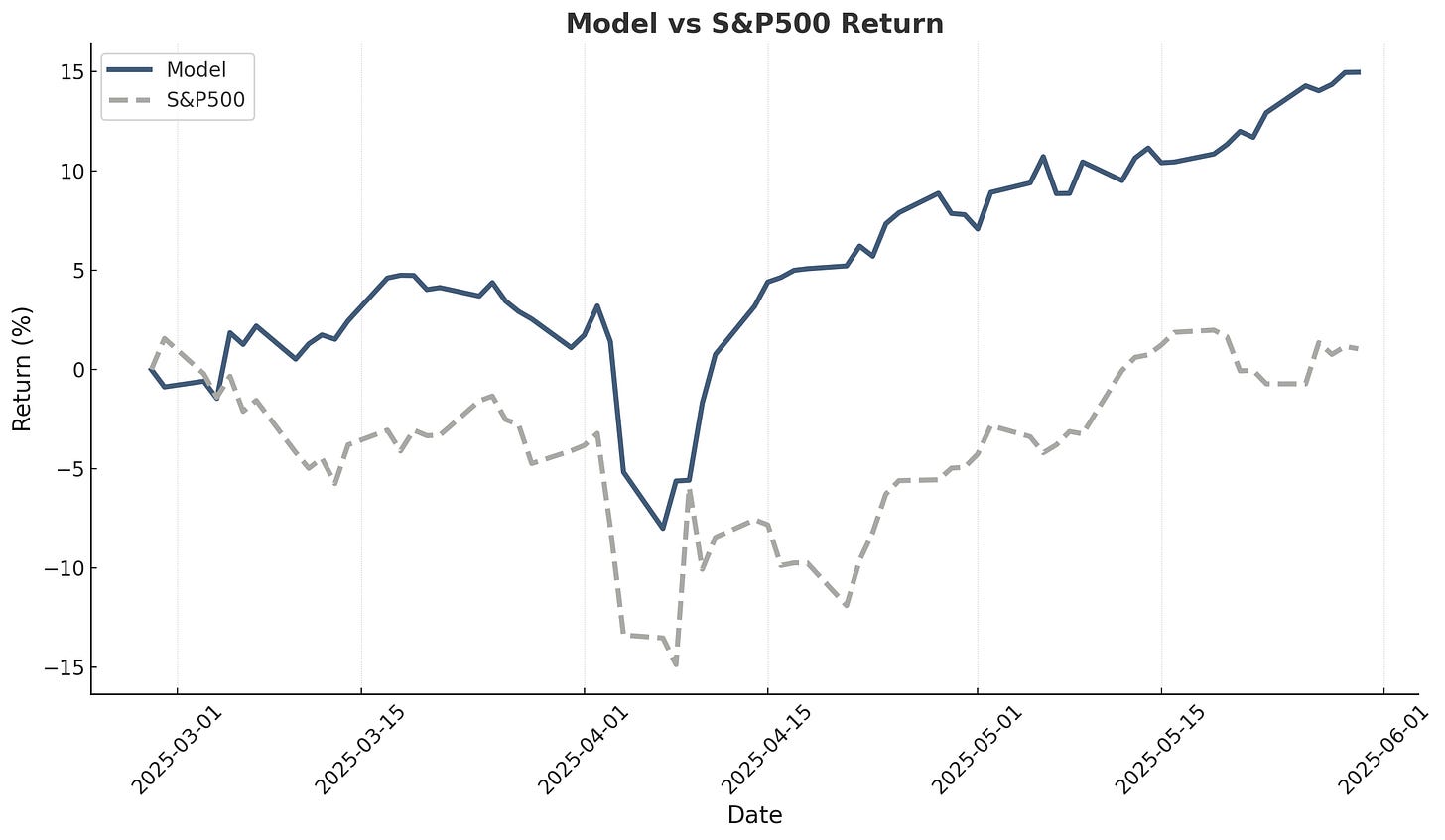 The Alpha Engineer model portfolio continued its strong performance, gaining 6.7% in May, matching its April return. This represents an alpha generation of 0.4% versus the S&P 500, notable given the portfolio's international focus—with only 4 U.S. stocks among its holdings. Since inception on February 28th, the model portfolio has delivered an impressive 15% gain compared to the S&P 500's 1% return.