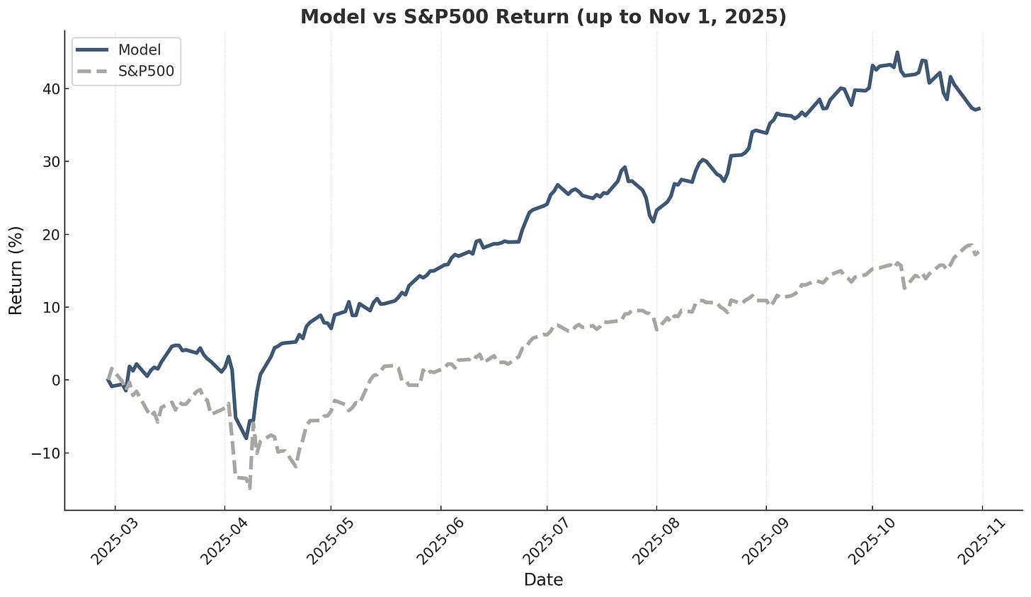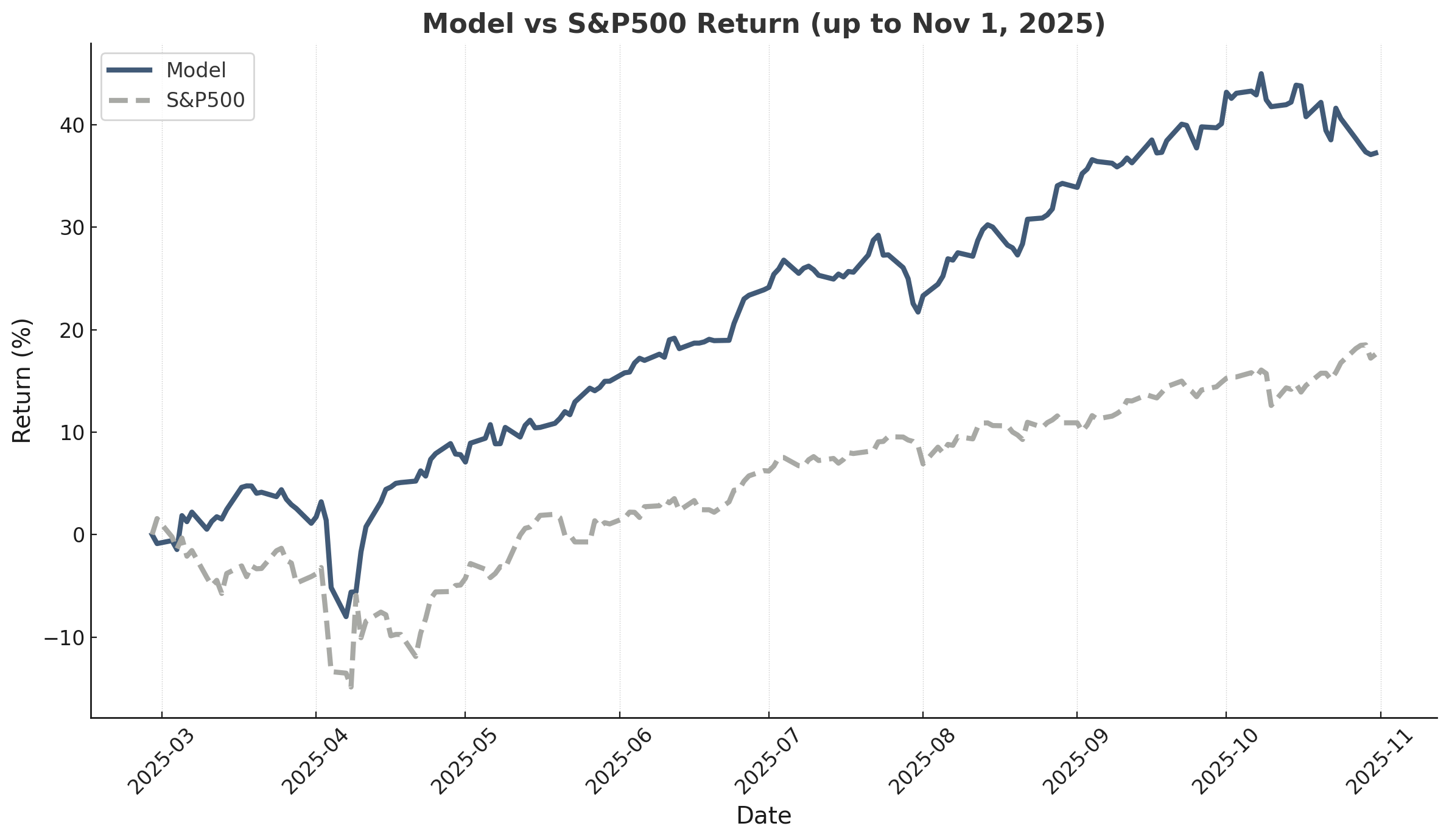 The model portfolio delivered -2% in October and +36.9% since inception 8 months ago, outperforming the S&P 500 by 19.1 percentage points over that period and beating the index in 6 of 8 months. October marked the portfolio’s worst performance to date in both absolute and relative terms, driven primarily by the underperformance of micro- and small caps and the sharp decline in precious metal miners.