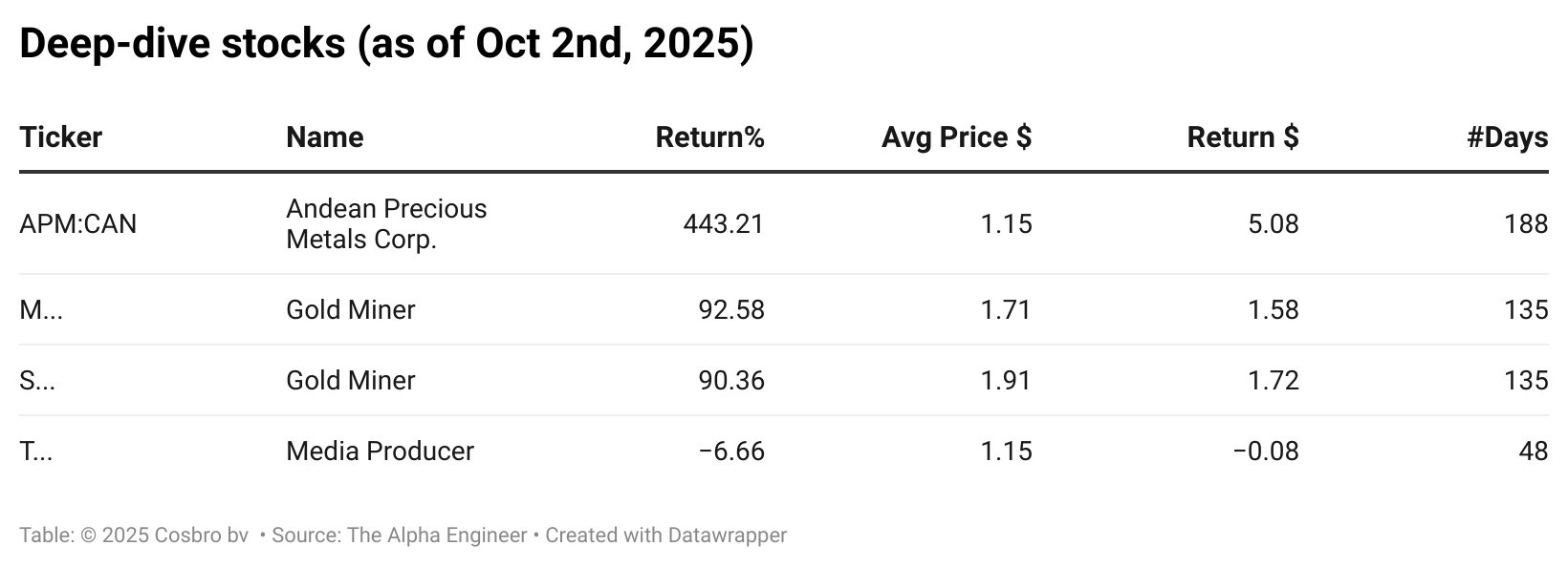The portfolio's current largest position (8.3%) is gold and silver miner APM, a deep-dive stock that is currently 499% up since entry. It currently holds another multibagger. Two deep-dive stocks are up 82% and 85% in the portfolio. The portfolio currently has 5 realized trades with +88% returns (112.7% gain on average) and 5 trades with -39% returns (45.6% loss on average).