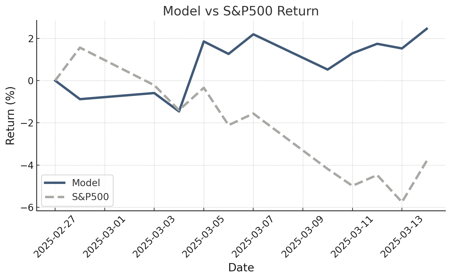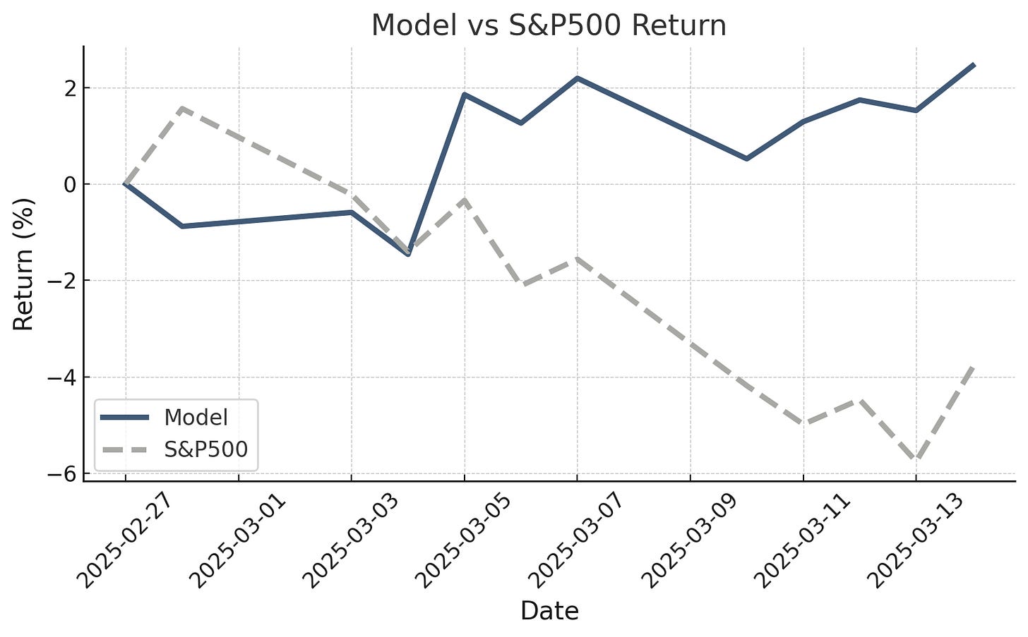 From its official start on February 27th onward, the Alpha Engineer Model Portfolio achieved remarkable outperformance compared to the S&P500. While the S&P500 declined notably, the portfolio demonstrated resilience and delivered positive returns.