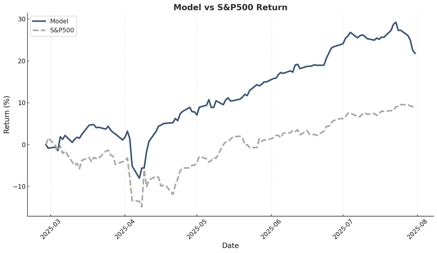 The Alpha Engineer model portfolio peaked in mid-July with nearly 30% returns since inception, but faced headwinds from escalating trade tensions, particularly in the final week of the month. The model delivered -1.7% in dollar terms during July, tracking closely with European equities given its current 80% European concentration. While the model underperformed the S&P 500 by 4% this month, it maintains a substantial edge since inception with 21.8% gains versus the S&P 500's 9.1% return.