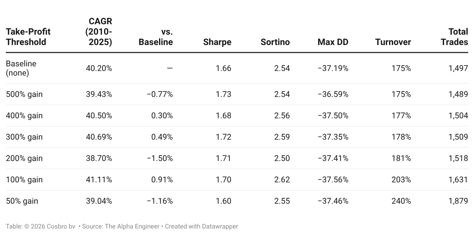 The most striking finding is how little the take-profit threshold matters for long-term returns. Every variant—from the aggressive 50% cap to the lenient 500% cap to the rank-qualified version—delivered a CAGR between 38.70% and 41.11%. The differences from baseline range from -1.50% to +0.91%, well within the noise expected from backtesting.